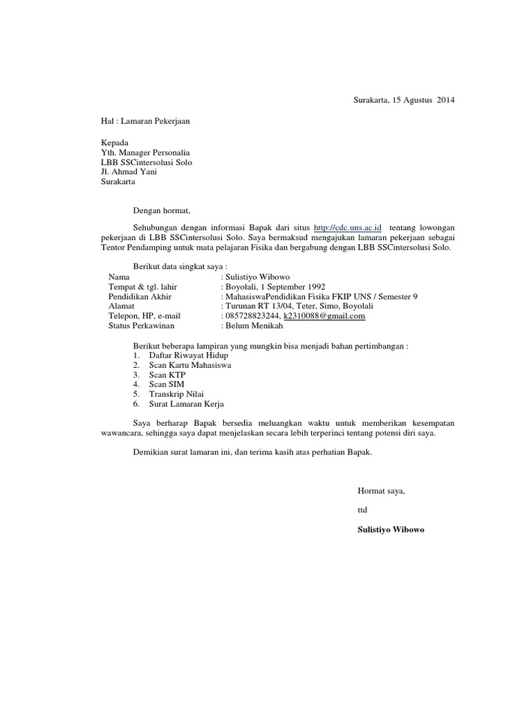 Berikut contoh surat lamaran pekerjaan yang bisa kamu download file dokumennya juga, link di bagian akhir artikel. Posting terkait surat lamaran pekerjaan bisa juga diartikan dengan suatu surat dari calon karyawan kepada calon majikan yang berisi permintaan supaya karyawan diberi pekerjaan oleh calon majikan. Contoh surat keterangan dokter (1) contoh surat keterangan kerja (1) contoh surat keterangan penghasilan (2) contoh surat lamaran (11) contoh surat lamaran kerja (12) of employment within aryaduta hotel jakarta, herewith this letter i would like to apply for the position as laundry attendant. Kepala personalia nusa dua beach hotel & spa denpasar bali. Contoh surat lamaran pekerjaan berikut ini kami sajikan kepada para pelamar atau pencari kerja agar lebih mudah dan cepat mengajukan lamaran sesuai dengan posisi jabatan atau pekerjaan yang ditargetkan. Jika anda membutukan contoh surat lamaran kerja umum, anda bisa coba baca beberapa referensi yang telah kami buat dari text dan dengan gambar. Jakarta, 17 oktober 2011 hal: Dan berikut kami akan memberikan contoh surat lamaran kerja lengkap. Dengan hormat, berhubungan dengan informasi lowongan kerja pada pt mitra pasifik bisa dilihat dari contoh isi surat lamaran kerja tulis tangan diatas, anda hanya perlu mengisi kemampuan yang sesuai dengan posisi dari lowongan kerja. Bekerja disini maksudnya adalah bekerja kepada orang lain dan mendapatkan gaji. Sesuaikan dengan jenis lamaran yang akan dikirim. Hal ini agar surat lamaran kerja anda dilirik oleh pihak perusahaan. Berikut kami sampaikan mengenai contoh surat lamaran kerja umum sebagai marketing yang bisa anda simak.