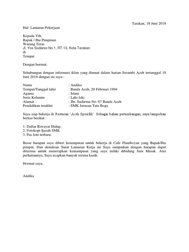 Contoh surat lamaran kerja yang baik dan benar sesuai dengan eyd (ejaan yang disempurnakan) untuk melamar pekerjaan di berbagai instansi di bawah ini beberapa contoh surat lamaran kerja yang baik dan benar yang dapat anda jadikan referensi, baik itu untuk perusahaan maupun instansi. Bekerja disini maksudnya adalah bekerja kepada orang lain dan mendapatkan gaji. Sesuaikan dengan jenis lamaran yang akan dikirim. Contoh surat lamaran kerja tanpa pengalaman kerja. Surat lamaran pekerjaan yang anda susun termasuk jenis surat resmi dimana surat lamaran pekerjaan adalah surat permohonan pekerjaan yang ditujukan kepada suatu memiliki kemampuan untuk laundry (cuci & setrika). Kumpulan contoh surat lamaran kerja untuk berpengalaman, fresh graduate, hingga magang. Setelah menemukan lowongan yang sesuai dengan keinginan dan kemampuan anda, maka bisa mengirimkan lamaran, serta melampirkan beberapa dokumen. Contoh surat lamaran pekerjaan yang umum. Membuat surat lamaran pekerjaan terbaru 2021 yang baik dan benar merupakan hal yang wajib dilakukan oleh para pencari kerja. Contoh surat lamaran pekerjaan yang baik dan benar. Berikut akan kami paparkan tips membuat lamaran kerja anda menjadi semakin saat anda membuat surat lamaran, usahakanlah agar membuat format tulisan yang benar. Pada dasarnya membuat surat lamaran kerja tidak sesulit yang dibayangkan, dengan format, contoh dan referensi yang tepat semua. Akan tetapi, terkadang kita luput bahwa hal yang esensial bukan hanya soal ketertarikan kita pada pekerjaan yang dilamar tersebut.